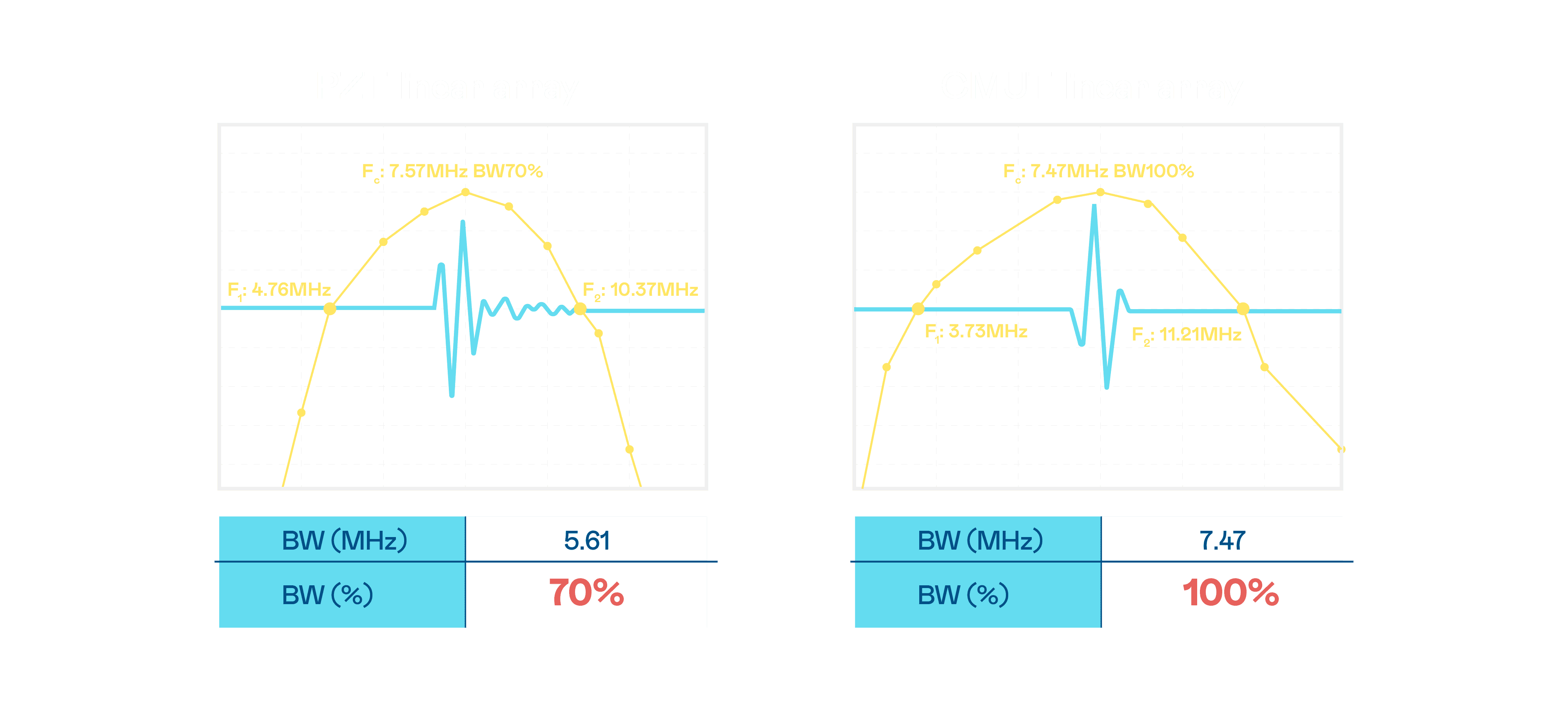 超音波影像的解析度高低,,,,首先取决于探头能发出的讯号频宽。。。尊龙z6 CMUT 可提供高清晰的超音波讯号,,提供高频宽、、、、高灵敏度、、、、影像纹理细节更高的超音波影像,,,协助医护人员缩短影像判读时间及利用精准的医疗影像进行诊断。。。